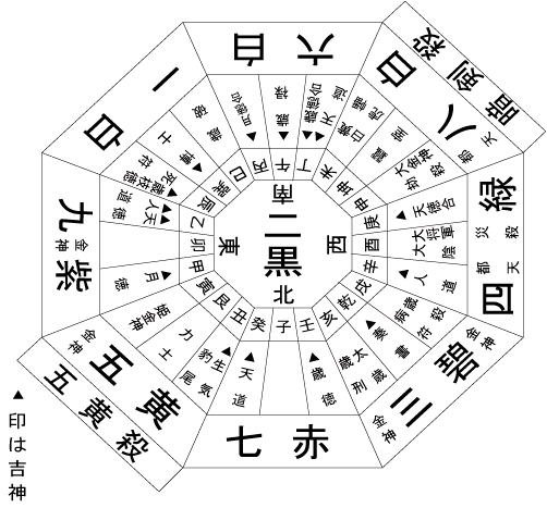 | 九紫火星 | 八白土星 | 七赤金星 | 六白金星 | 五黄土星 | 四緑木星 | 三碧木星 | 二黒土星 | 一白水星 |