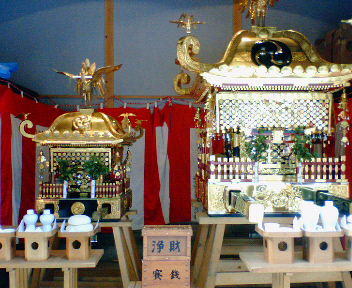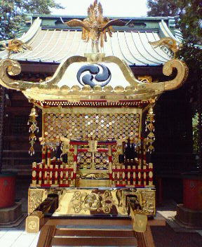 当神社では1年おきに「本祭り」と「陰祭り」があり、本祭りには御神輿の渡御(宮出し・午前11時〜宮入り・午後5時)がございます。渡御は日曜に行なわれ、ラ・ラストリート(旧すずらん通り・赤羽最大のアーケードどおり)では多数の買い物をする皆さんから歓声が沸き起こります。
