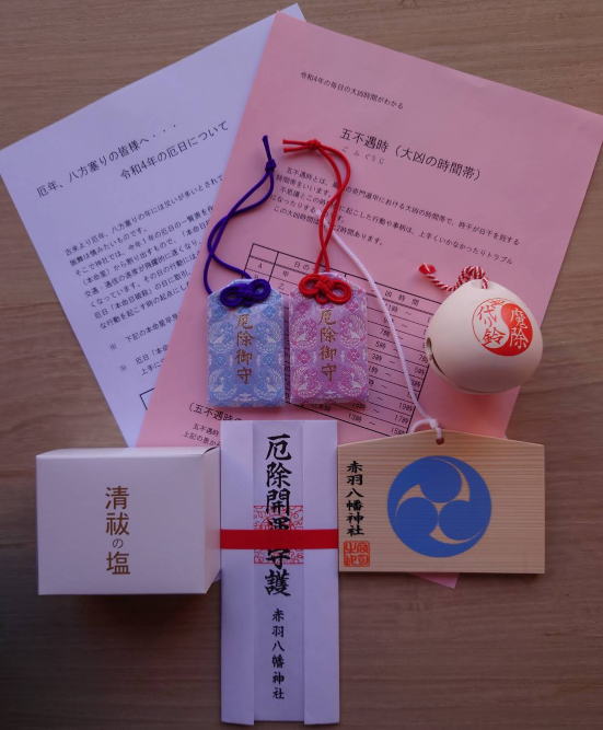 | ◎厄除けのご祈祷の方には、御守、御札、清め塩、身代り鈴、絵馬、日破殺・五不遇時一覧表が授与されます。 *厄除けのお祓いをご希望の方は、赤羽八幡神社までお電話でご予約ください。諏訪神社・熊野神社・香取神社・八雲神社でのお祓いをご希望の方は、その旨をお伝えください。 |